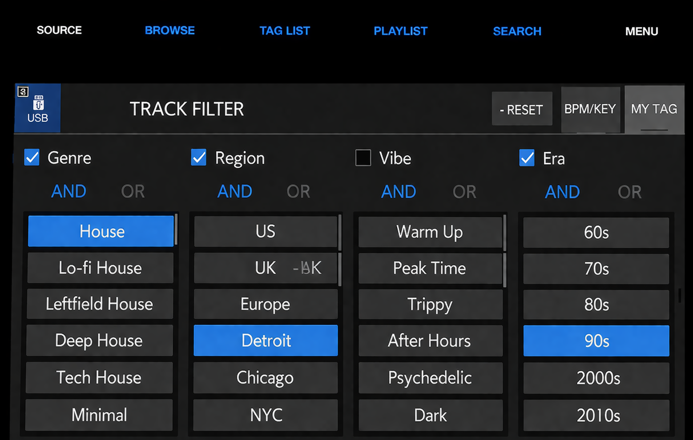 Once your tags are synced, you can filter your library in Rekordbox — and on CDJs that support My Tag filtering (CDJ-3000, XDJ-XZ, and others).