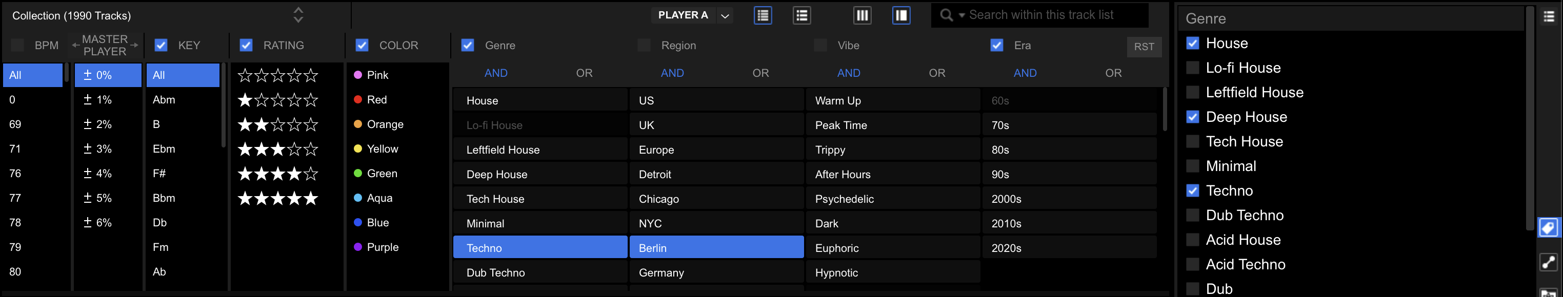 - Genre — 50+ options from Deep House to Acid Techno to Jungle. Subgenres include their parent: "Deep House" automatically includes "House."